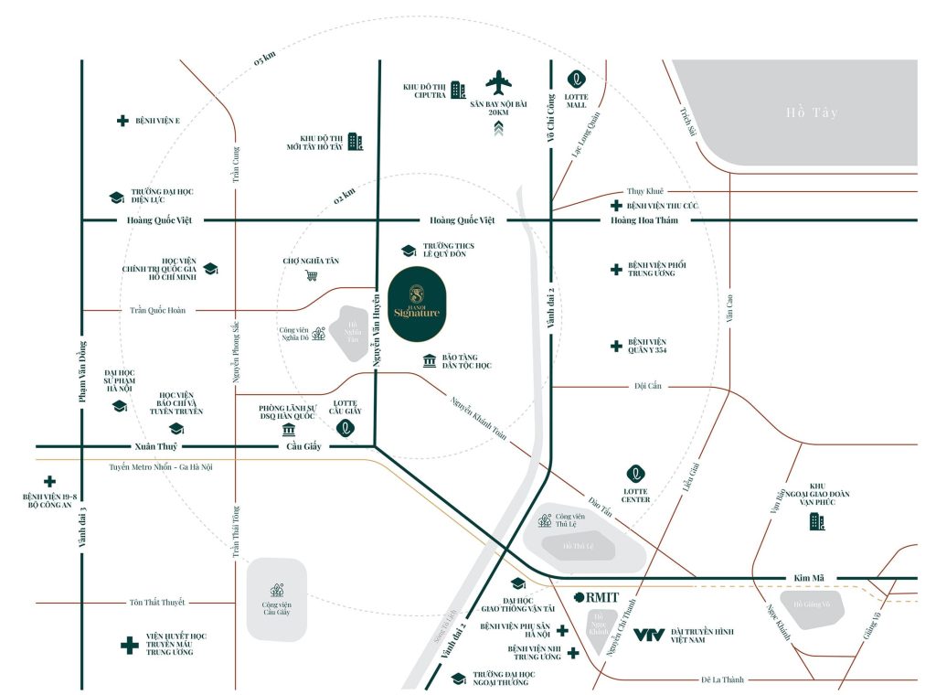 Không chỉ dừng lại ở đó, Hanoi Signature còn kết nối thuận tiện với các trung tâm kinh tế, văn hóa và giải trí quan trọng của thành phố. Như Trung tâm Ba Đình, trung tâm hành chính mới Tây Hồ Tây, Hồ Tây thơ mộng, Lotte Mall West Lake sầm uất. Chỉ cách sân bay Nội Bài 30 phút di chuyển.