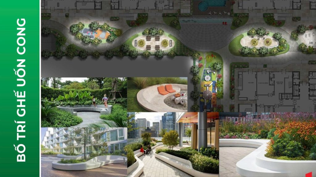 Bố trí ghế uốn cong nghệ thuật kết hợp mảng xanh, tạo không gian thư giãn hiện đại và gần gũi với thiên nhiên.