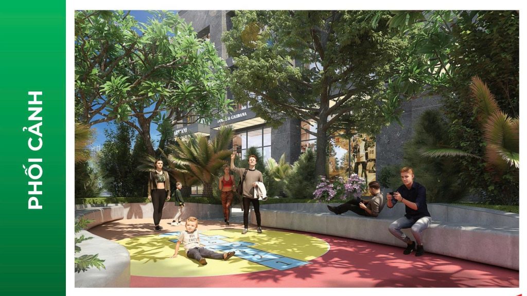 Không gian sinh hoạt chung – Khu vực ghế ngồi uốn cong xen kẽ cây xanh mát mẻ, kết hợp sân chơi trẻ em và lối đi bộ, mang đến trải nghiệm thư giãn và gắn kết cộng đồng