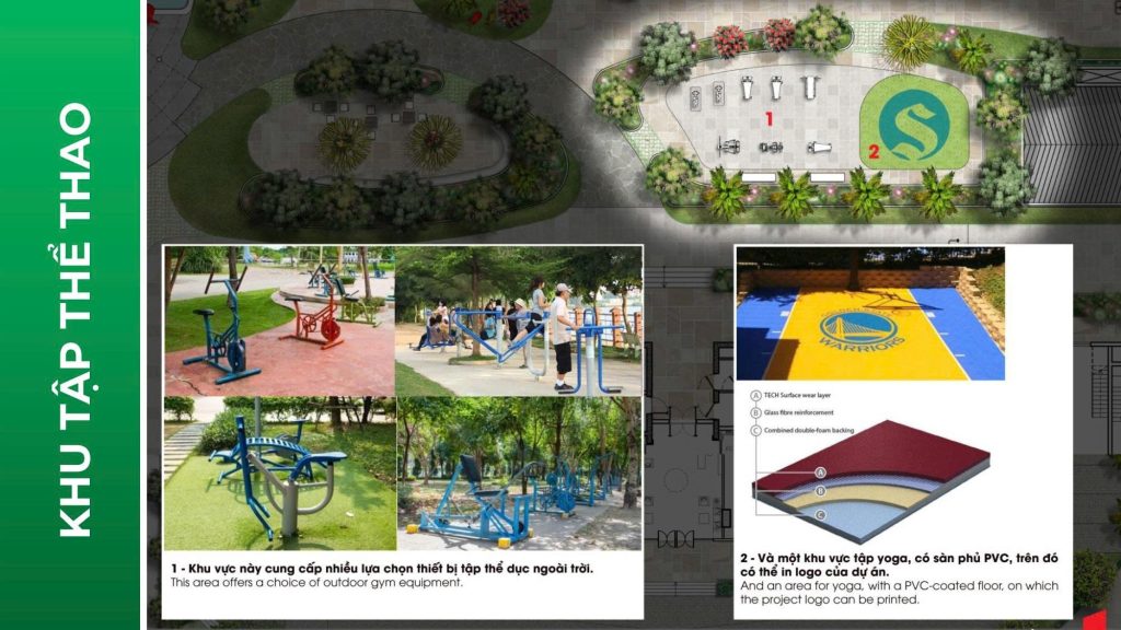Khu tập thể thao ngoài trời được trang bị đầy đủ dụng cụ thể dục đa dạng, tạo không gian rèn luyện sức khỏe hiện đại và tiện nghi cho cư dân.