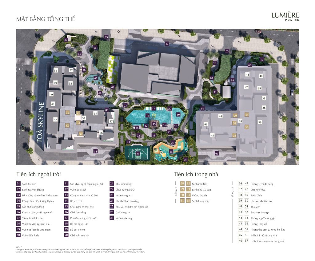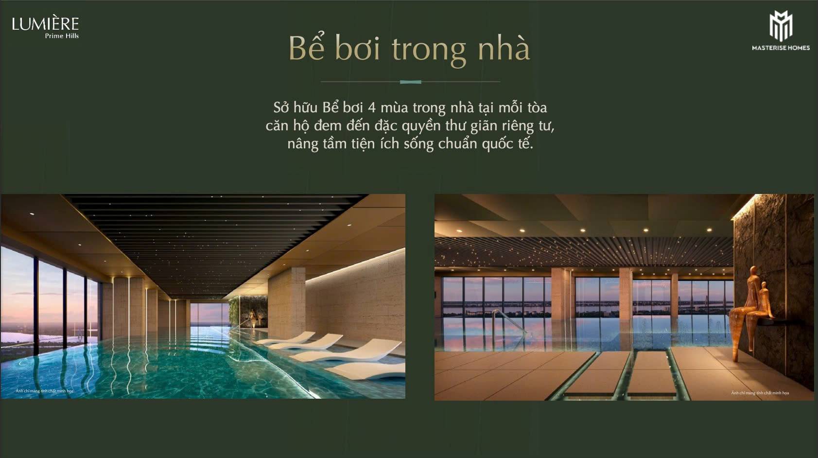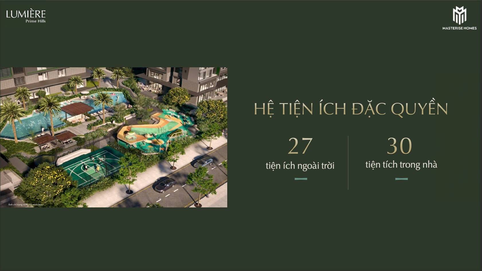 Lumiere Prime Hills tích hợp tới 57 tiện ích đẳng cấp. Dự án bao gồm 27 tiện ích ngoài trời và 30 tiện ích trong nhà. Mang đến không gian sống lý tưởng cho mọi thành viên trong gia đình.