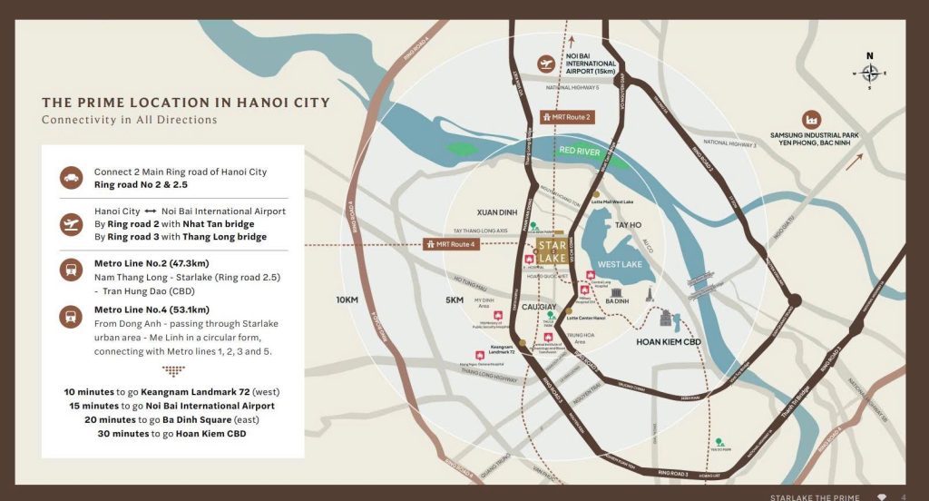 Tây Hồ Tây là trục phát triển chiến lược của Hà Nội, nơi hạ tầng trục Võ Chí Công – Phạm Văn Đồng – cầu Nhật Tân bồi đắp lợi thế kết nối trung tâm – sân bay Nội Bài và các quận lõi như Ba Đình – Cầu Giấy. Bước sang giai đoạn 2, Starlake chuyển dịch từ “đô thị mẫu” sang “cực tăng trưởng” về thương mại – ngoại giao. The Prime K8HH1 nằm đúng tâm điểm khu vực này, thừa hưởng mạng lưới cơ quan ngoại giao – văn phòng – trường quốc tế và một chuẩn cư dân có yêu cầu cao về an ninh, tiện nghi và tính quốc tế.
