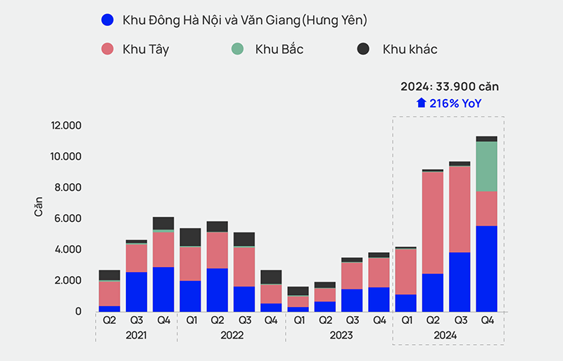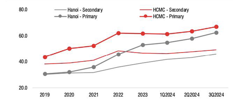 Theo báo cáo của CBRE, giá bán căn hộ sơ cấp tại Hà Nội trong quý IV/2024 đạt trung bình 80 triệu VNĐ/m², tăng gần 7% so với cùng kỳ năm trước. Phân khúc cao cấp chiếm tỷ trọng lớn trong nguồn cung mới, tập trung tại Tây Hồ, Cầu Giấy, Mỹ Đình và phía Đông thành phố. Savills cũng ghi nhận tỷ lệ hấp thụ đạt trên 85%, cho thấy nhu cầu ở thực và đầu tư đều duy trì mạnh mẽ. Bước sang 2025, nguồn cung mới dự kiến tiếp tục tăng, nhưng giá vẫn giữ xu hướng nhích lên nhờ quỹ đất trung tâm khan hiếm.