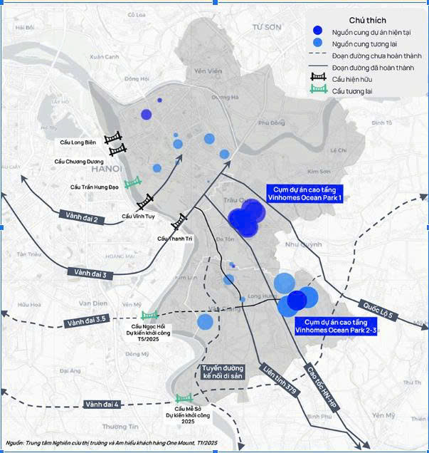 Nằm ở các quận ven đô: Hà Đông, Hoàng Mai, Đông Anh. Giá từ 85 – 100 triệu VNĐ/m². Phân khúc này thu hút tầng lớp trung lưu và nhà đầu tư dài hạn. Ví dụ, Smart City hay Vinhomes Ocean Park ghi nhận tỷ lệ hấp thụ nhanh nhờ giá vừa túi tiền, cộng đồng cư dân đông đúc.