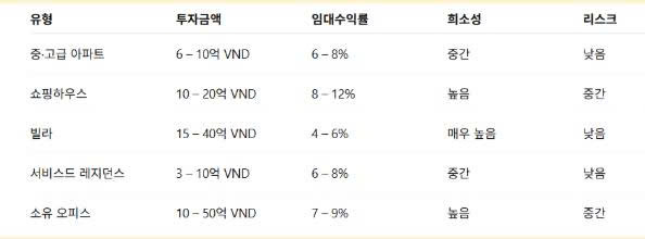임대 수익률: 중·고급 아파트 6~8%/년, 상업용 shophouse 10% 이상