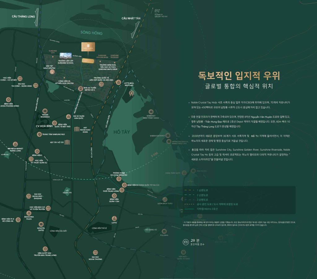 특히 Tây Hồ Tây 지역의 개발 계획으로, 하노이의 새로운 행정·외교 중심지로 부상하며, 외국인 거주자가 늘어나는 상황 속에서 Noble Crystal의 입지는 국제적 라이프스타일을 구현하고 장기적인 가치 상승을 보장합니다. 이 지역은 이미 국제 자본을 끌어들이는 “자석”과 같은 역할을 하고 있습니다.
