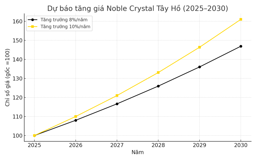 Hiện tại, giá bán Noble Crystal Tây Hồ dao động từ 200 – 270 triệu đồng/m². Với những căn đặc biệt có thể đạt 400-500 triệu đồng/m². Mức giá này cao hơn nhiều so với các dự án hạng sang khác tại Hà Nội. Sự chênh lệch về giá tạo nên biên lợi nhuận hấp dẫn cho nhà đầu tư quốc tế. Đặc biệt trong bối cảnh thị trường bất động sản cao cấp Hà Nội ngày càng khan hiếm. Các chuyên gia dự báo giá trị Noble Crystal có thể tăng 8-10%/năm trong giai đoạn 2025-2030. Dự án trở thành một trong những kênh đầu tư bền vững nhất tại Việt Nam.