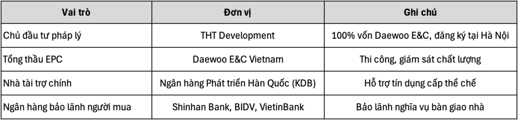 Sự kết hợp giữa Daewoo E&C – THT Development – KDB – Shinhan Bank tạo nên một cấu trúc tài chính và pháp lý gần như hoàn hảo.